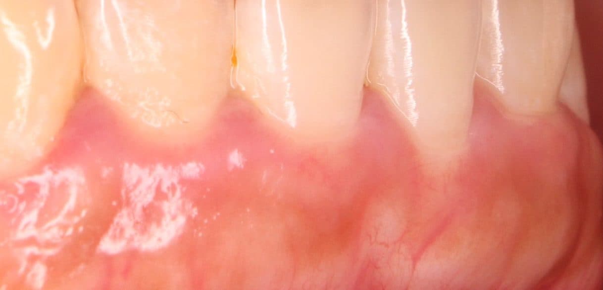 前歯部分を拡大してみると、歯肉が赤黒くなっているのがわかります。