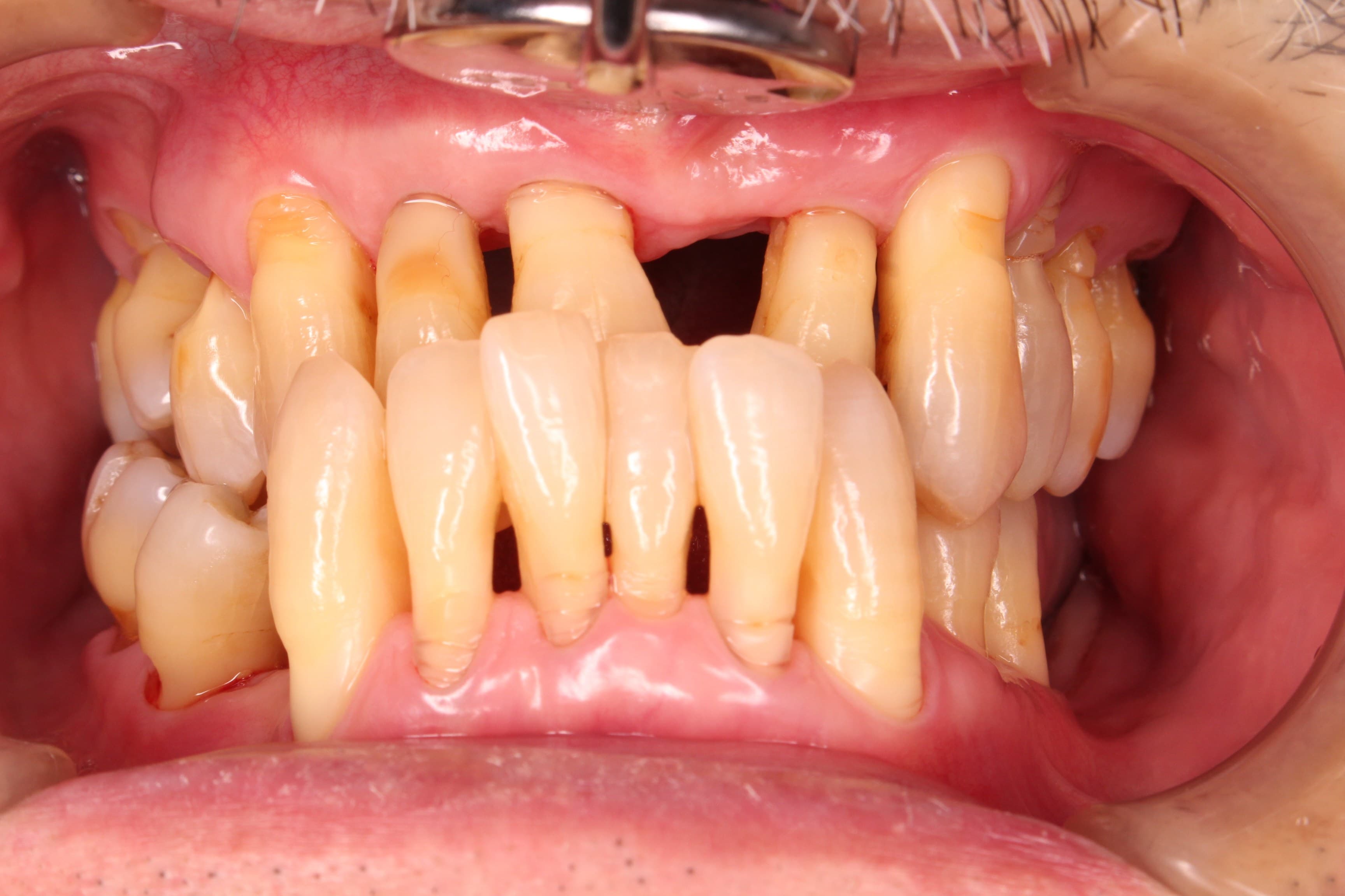 全体的に重度の歯周病で、部分的に動揺が激しく脱落しそうな状態でしたが、