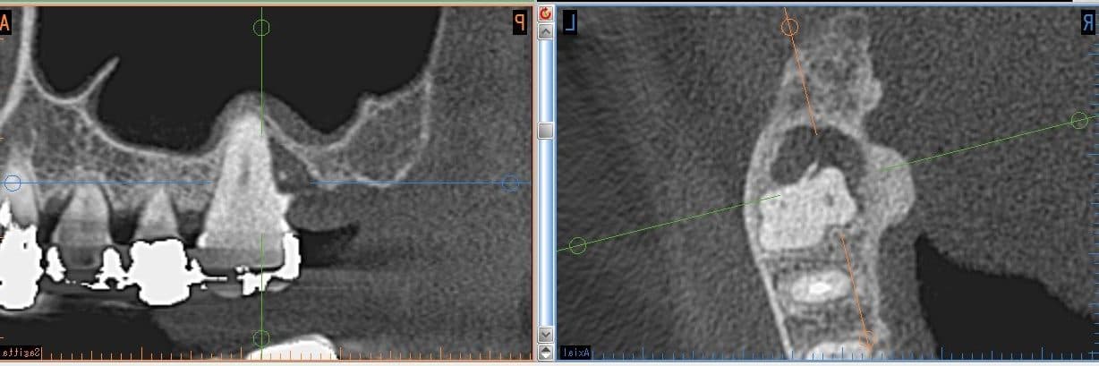 一部とても深いポケットがあり、歯を支える骨が大きく溶けています。従来のレントゲンでは分かりにくいですよね。