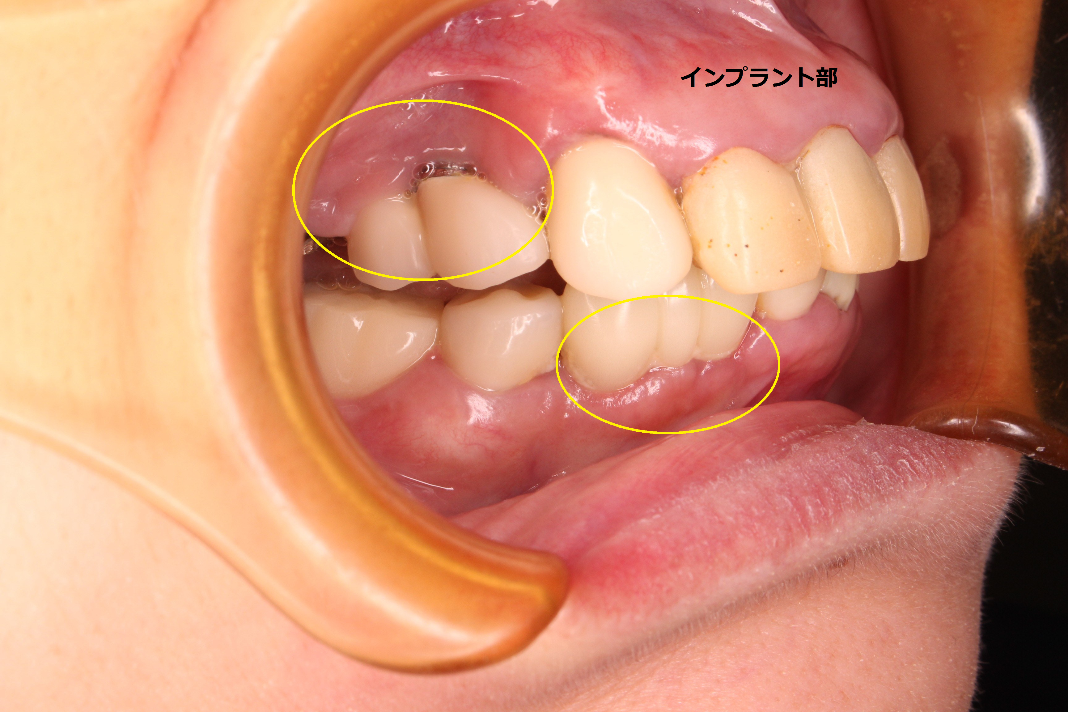 全体的に炎症(発赤、腫脹、出血、排膿等)が広がっており、数年前に他院で入れたインプラント部の周辺歯肉も腫れ上がり、排膿していました。