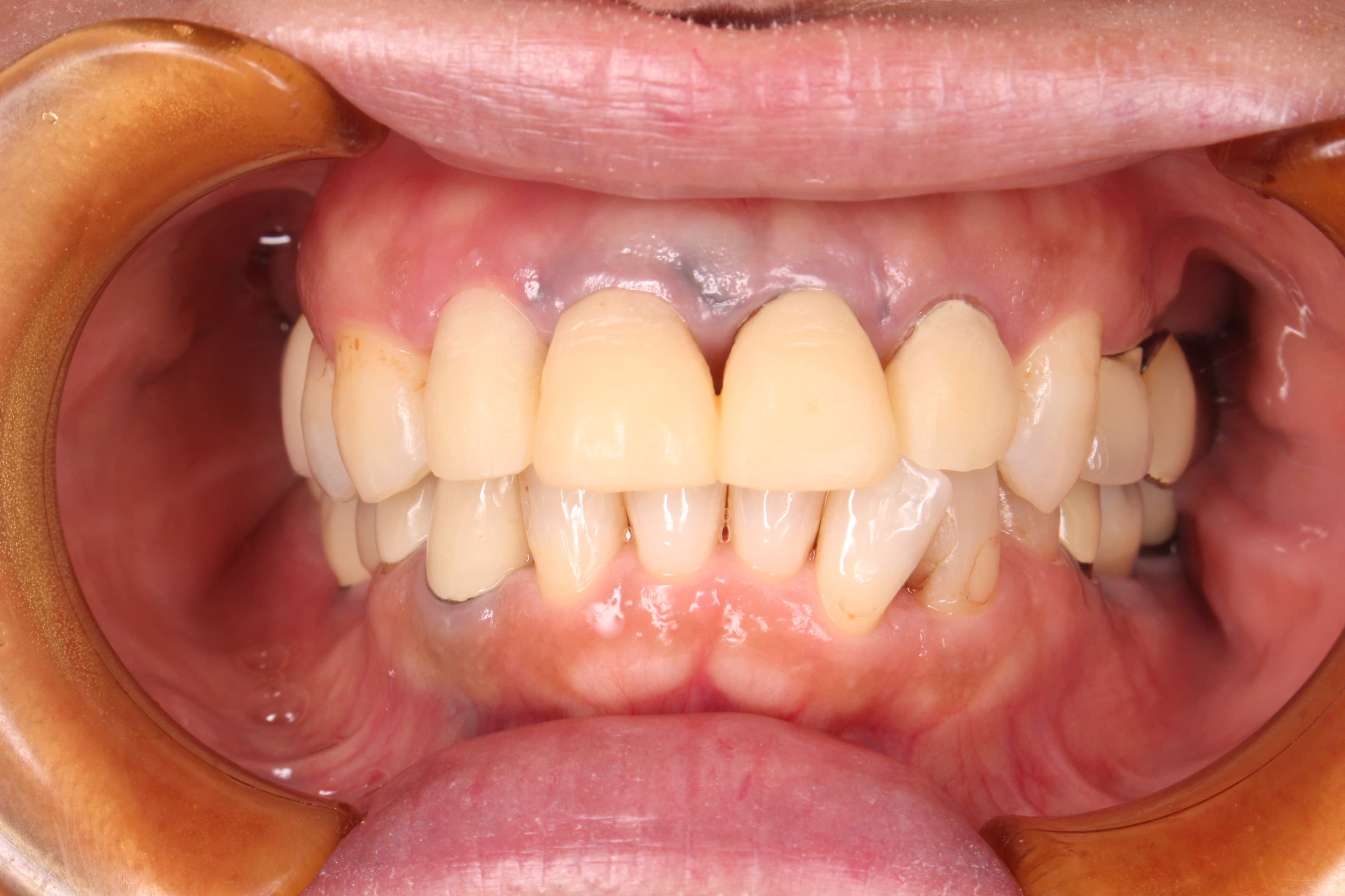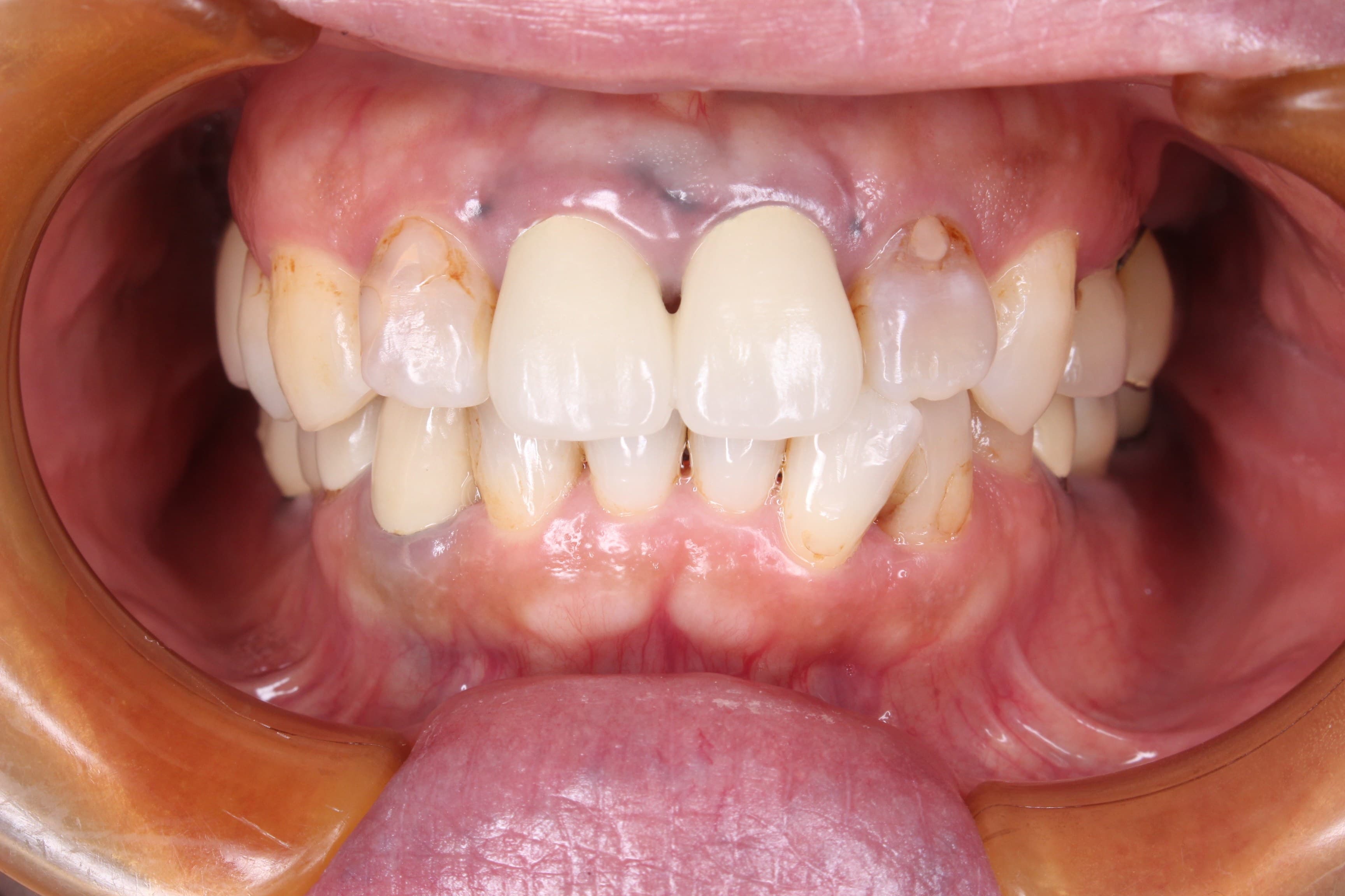 現在、前歯は仮歯に置き換えて、歯の形態や歯肉の形態を作り込んでいます。また根の病気もあったので、専門根管治療をおこなっており、これらが終了したあと、セラミックの被せ物で審美的な補綴治療を行う予定です。