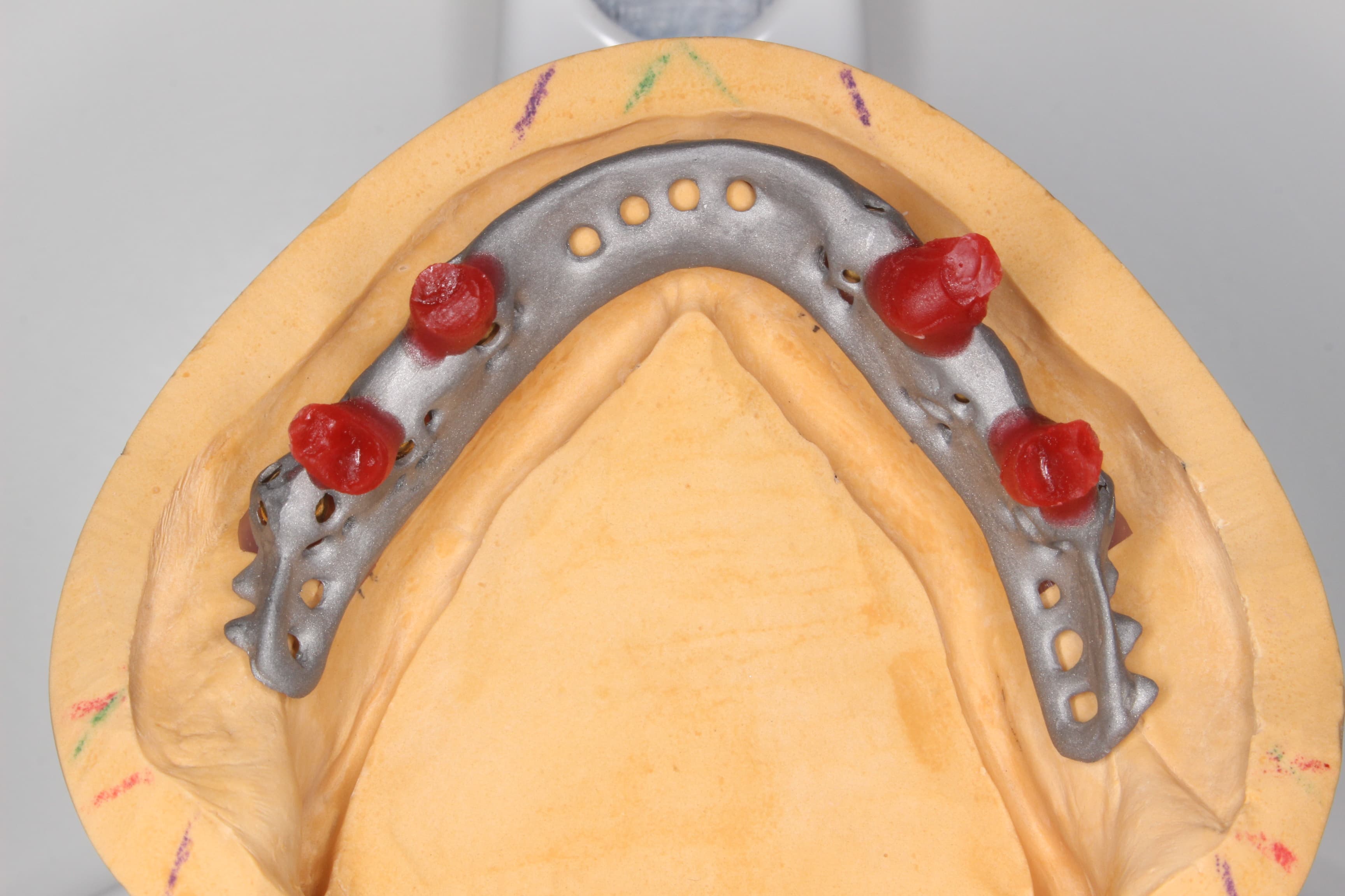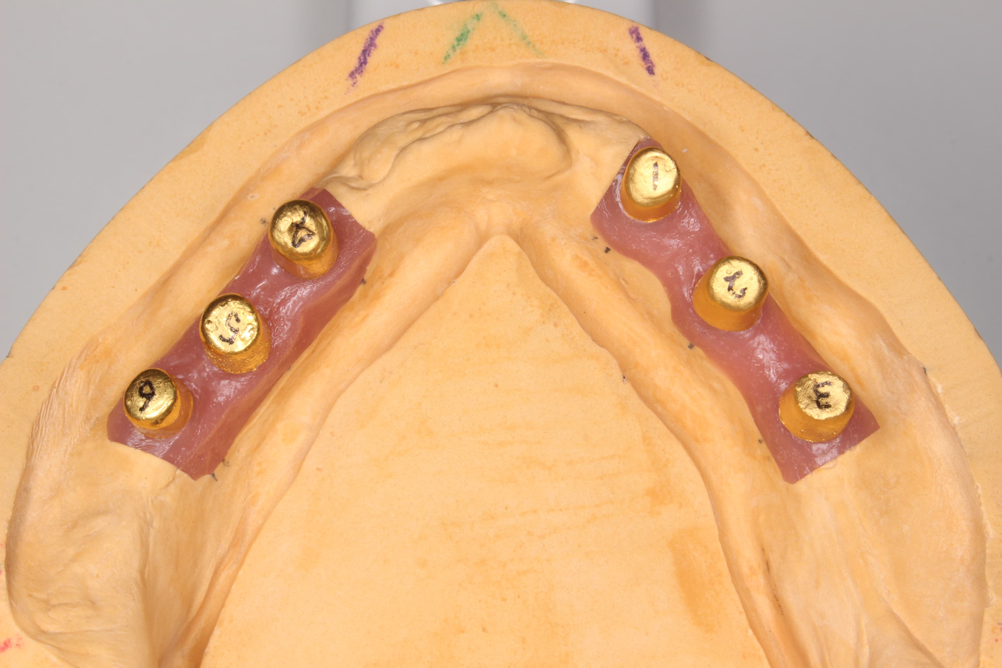 インプラントが埋入してある下顎の模型です。アバットメントといわれるインプラントと上部構造を繋ぐ治具がセットしてある模型です。