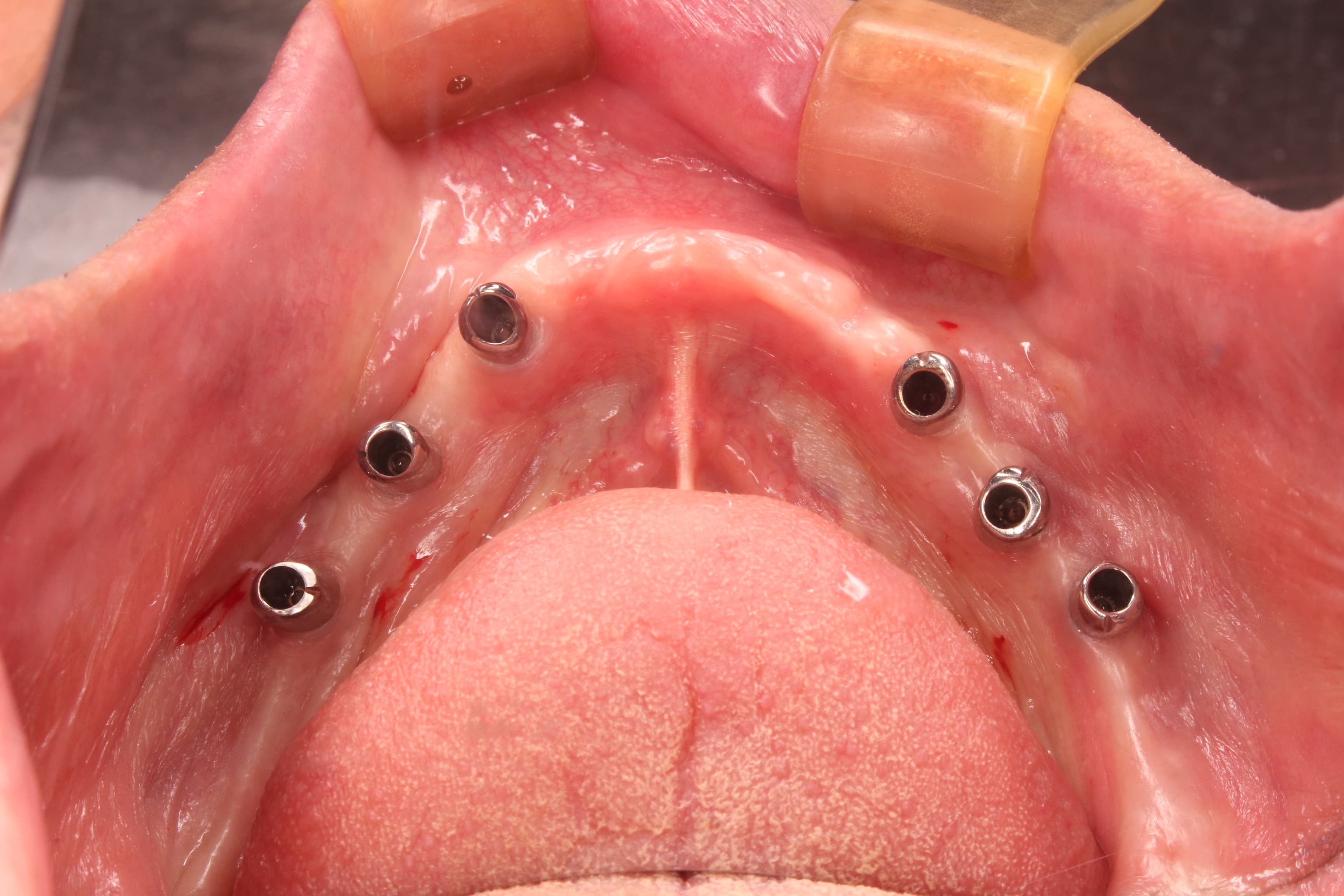 こういった治療ケースでは、顎位(上下の顎の位置)にズレがあると、違和感が強くなってしまいます。また骨があるからと自由にインプラントを埋入して進めていくと、今度は補綴の設計に無理が生じ、結果として見栄えや強度、装着感、発音や衛生面など多岐にわたる問題が発生してきますので注意が必要です。(勿論みなさんが通われているクリニックの先生方は、そのことを十分に承知していると思いますので、安心して聞いてみてください。)