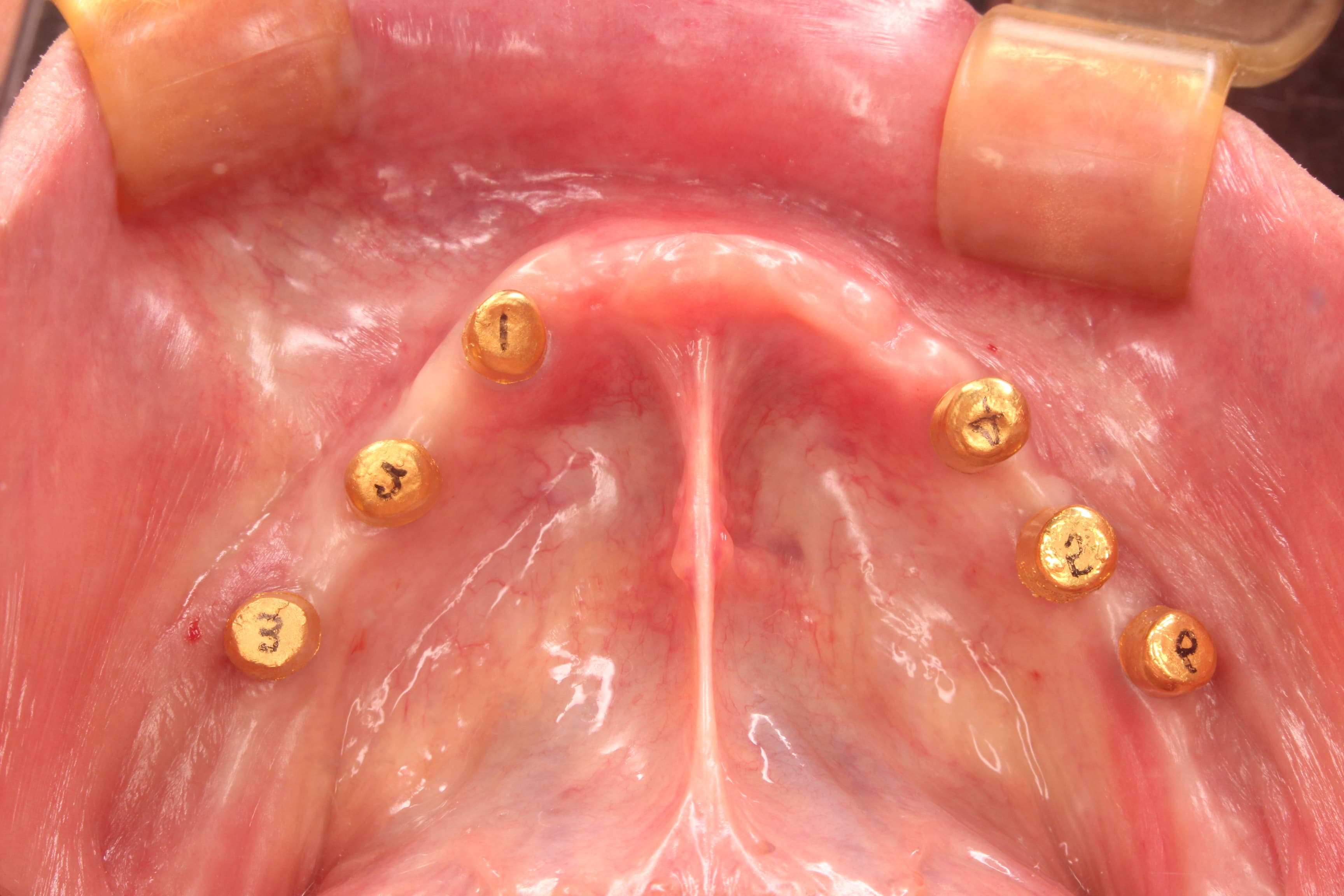 歯が全く無い方の場合、総義歯(総入れ歯)の治療に準じた方法で、咬み合わせの垂直的・水平的位置をはじめにしっかりと決めておくことがとても大事です。