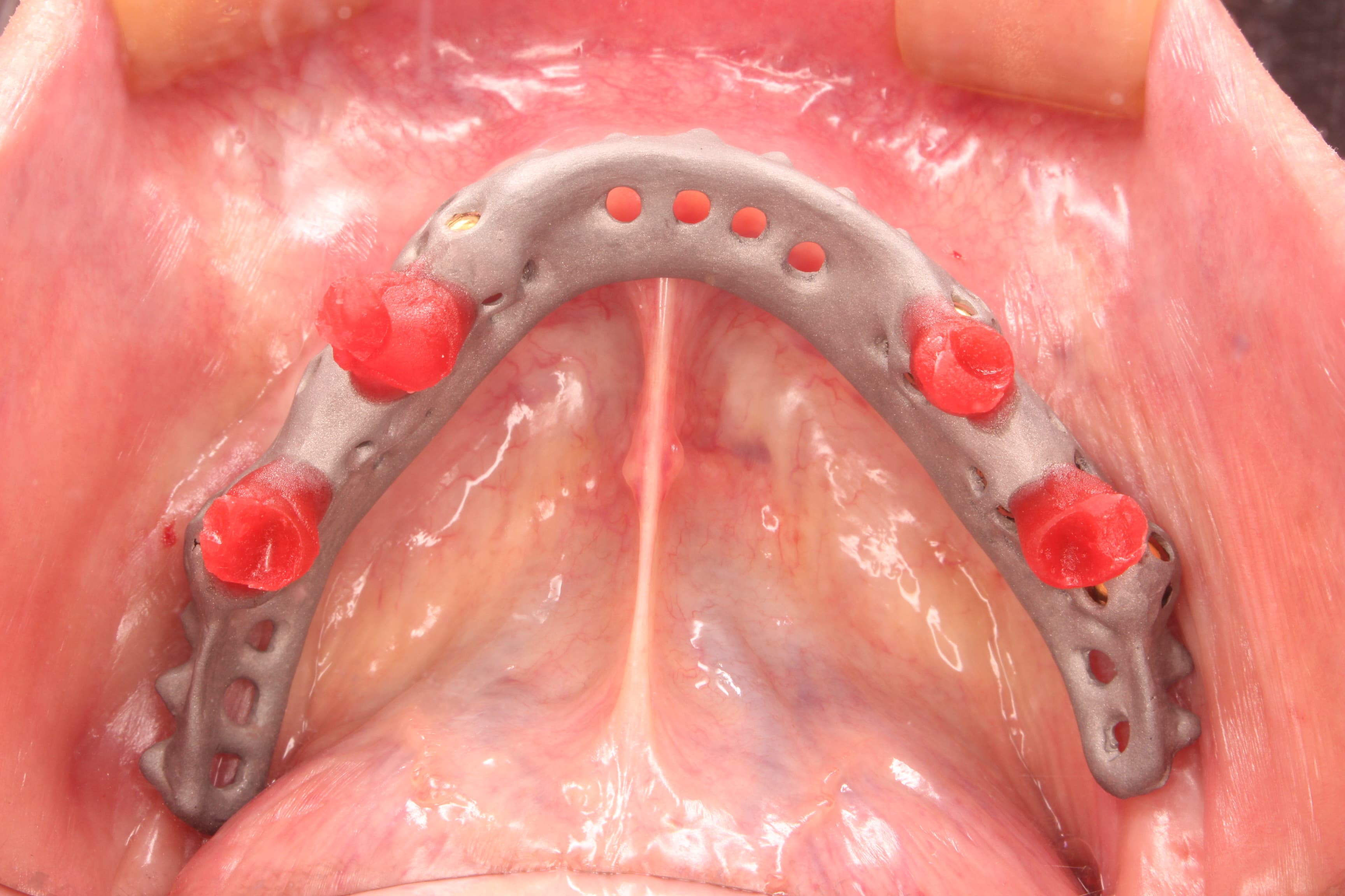 このあと、このフレームをシリコン印象材(正確に型を採るための材料)を使って、取り込み印象という方法で記録を採っていきます。