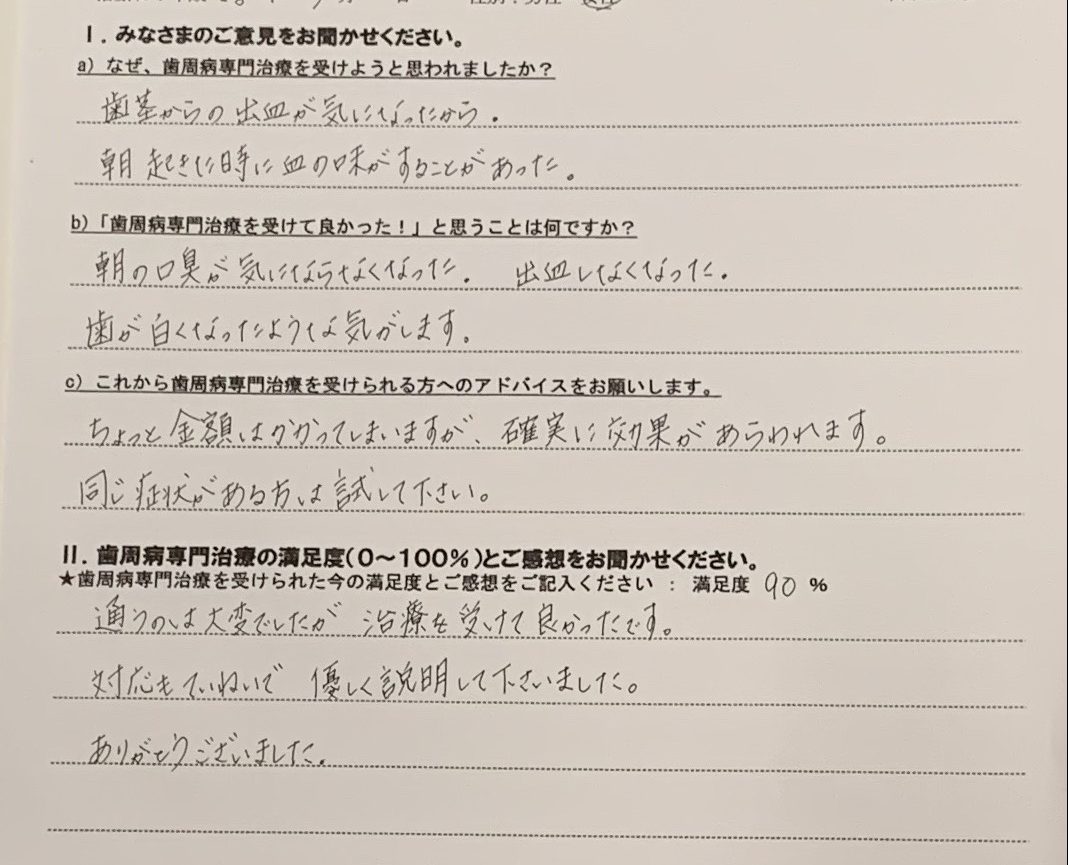 早い段階でしっかりと治療を受けて頂けたことで、出血、口臭共に確実に改善されました。