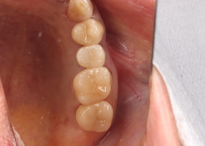 奥の歯2本は、それぞれ2次虫歯でしたが、神経は感染していなかったので、健康なエナメル質は温存して、セラミックとジルコニアで治療を行いました。