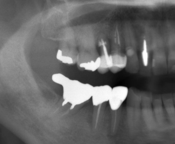 インプラントを行った部位の歯は、神経の処置がしてあり、痛みはありませんでしが、2次虫歯が酷く、また骨(歯槽骨)が破壊されており、残念ながら抜歯を行いました。