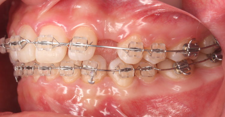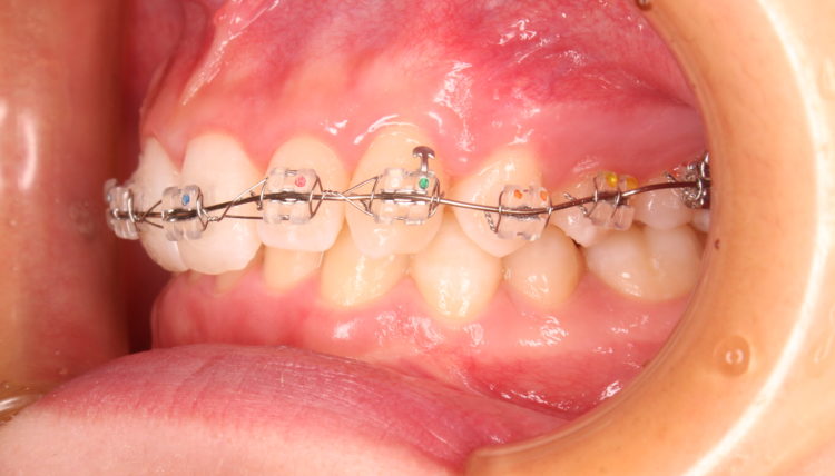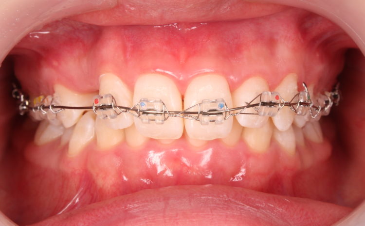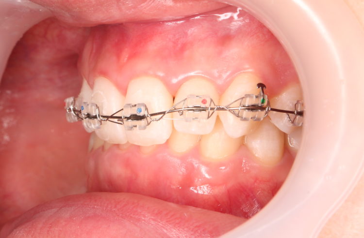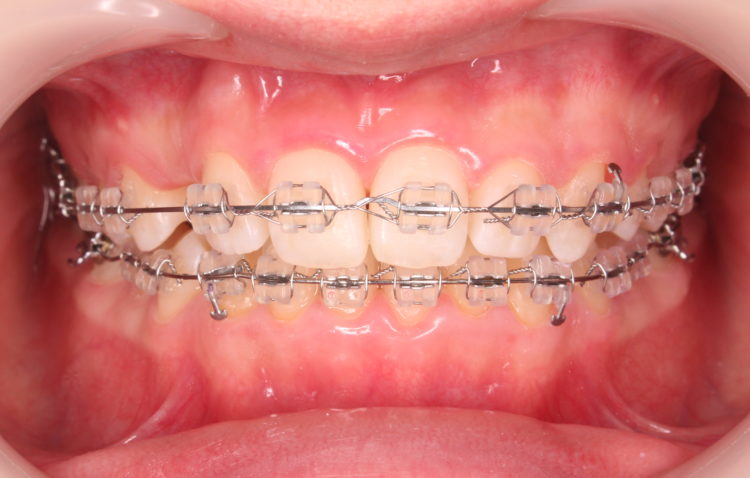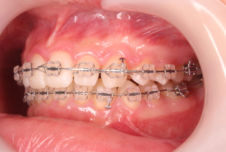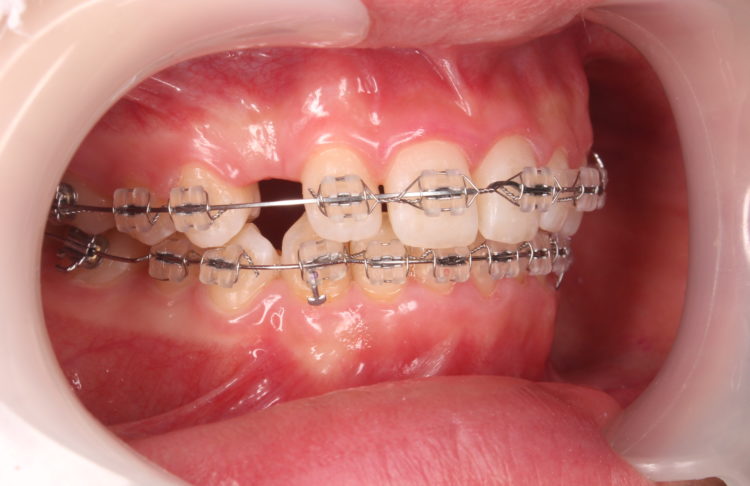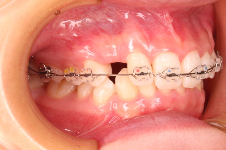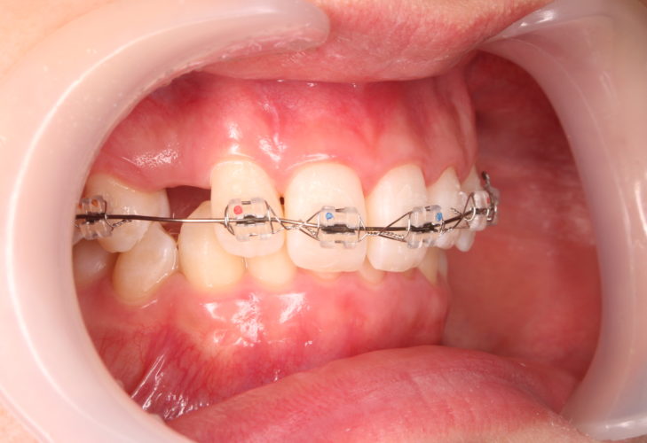 だいぶ上顎前歯が圧下され、下の前歯とのスペースが出来てきたので、矯正装置を装着しました。