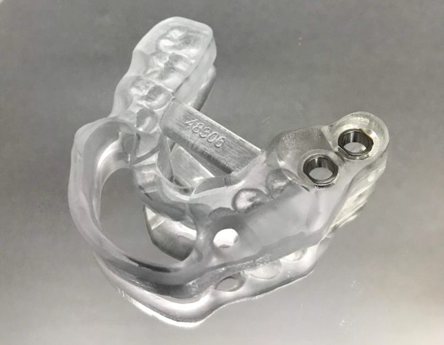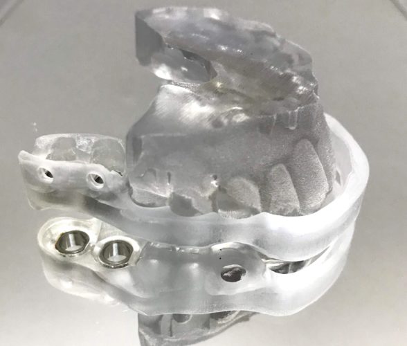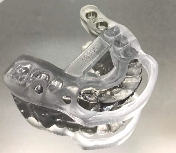 インプラントのシミュレーションデータを再現したガイドが、それにぴったりとフィットした状態で出来上がりました。