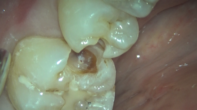 マイクロスコープ下で虫歯の取り残しがないよう注意しながら除去し、歯の神経にも感染は認められなかったので、セラミックでの審美的な回復を行いました。