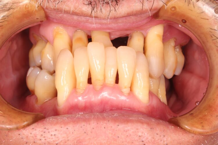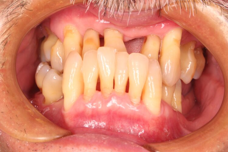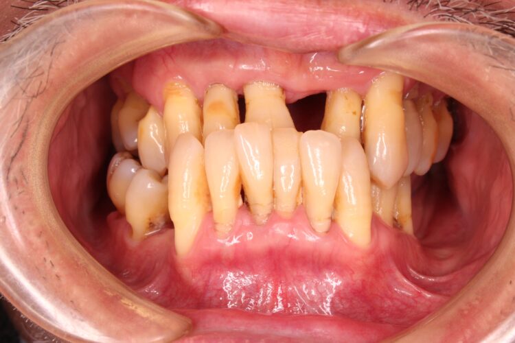 初診時には既に歯を支える骨が1/3以下しか残っておらず、ぷらぷらしている歯も多数ある状態で、凝り固まった歯石も多数あり、出血も多く、かなり厳しい状態からのスタートでした。