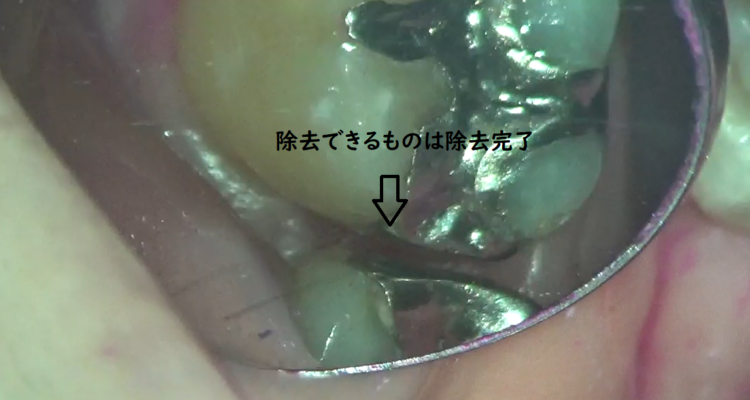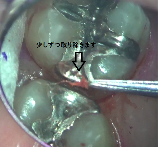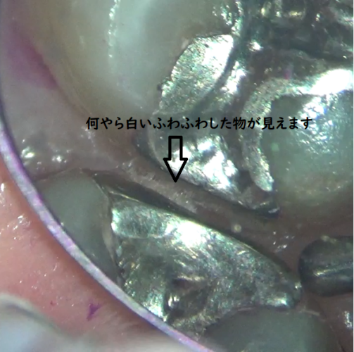 マイクロスコープで倍率を上げていくと、銀歯のふちのところに白い綿がくっついているのが見えてきました。