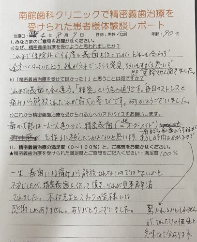 今回は、精密義歯治療を受けていただいた患者さんへのアンケートをご紹介させていただきます。