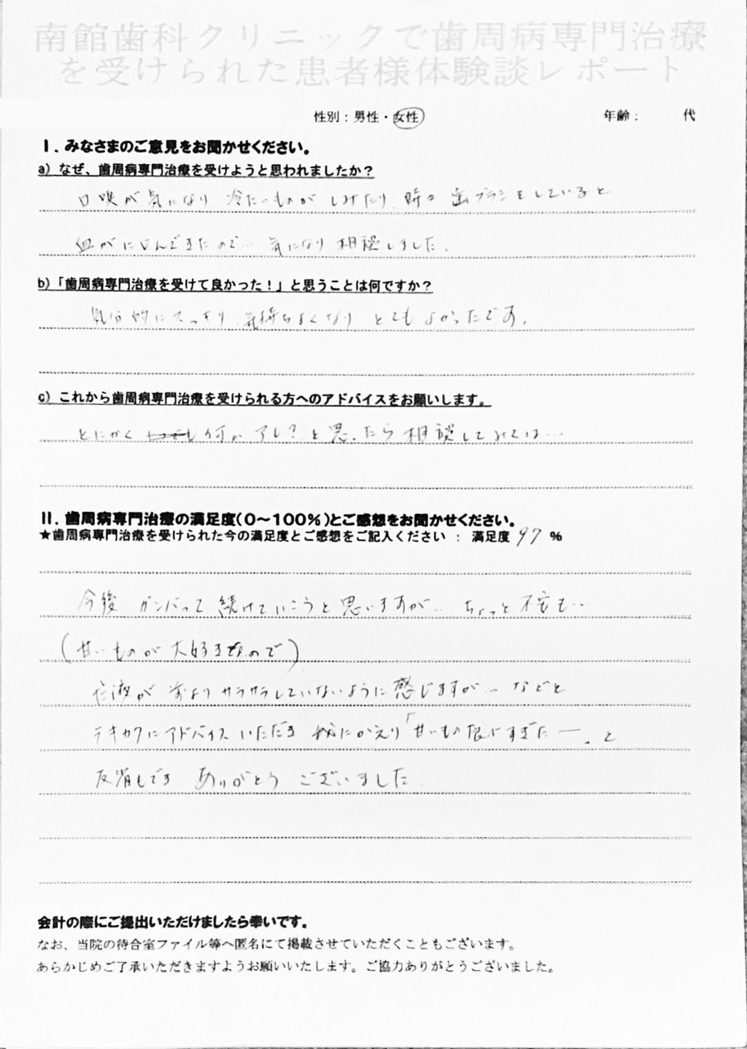 【患者様の声】歯周病専門治療を受けた女性の方です