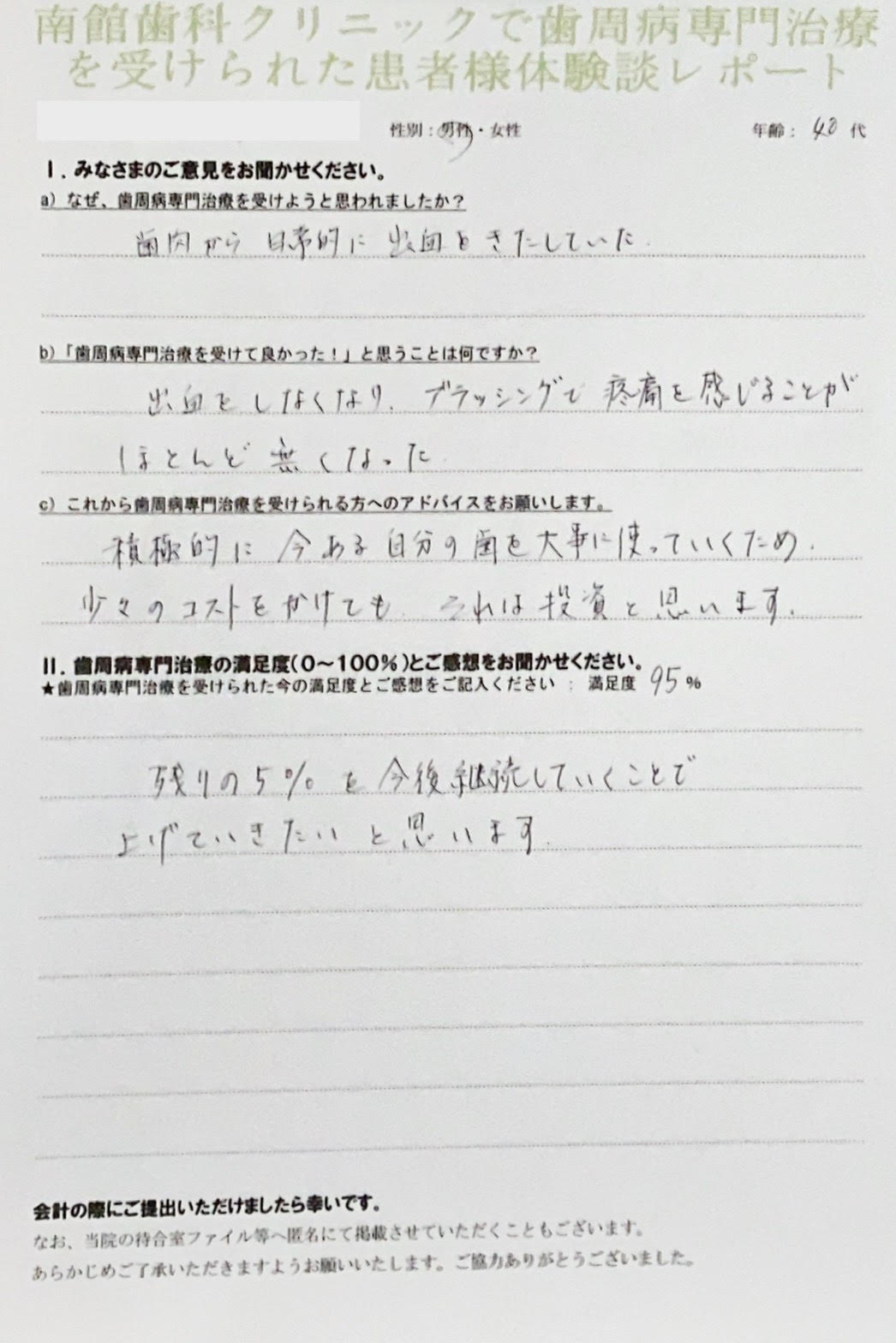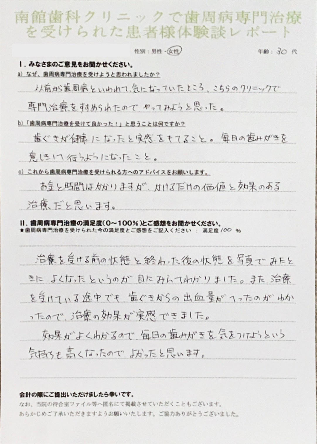 こんにちは! 南館歯科クリニックの歯科衛生士 山崎です。 歯周病治療を当院で受けた方の、実際の声をご紹介します。 年齢に関係なく必要な物と欲しい物をよく考える方が増えてきた様に感じます。 ご自身の健康…