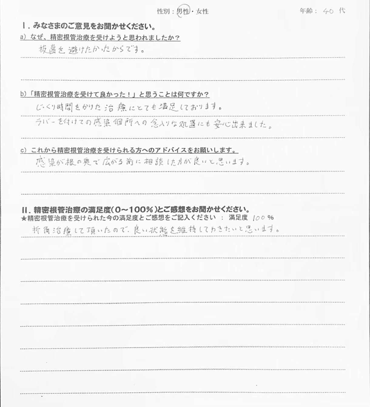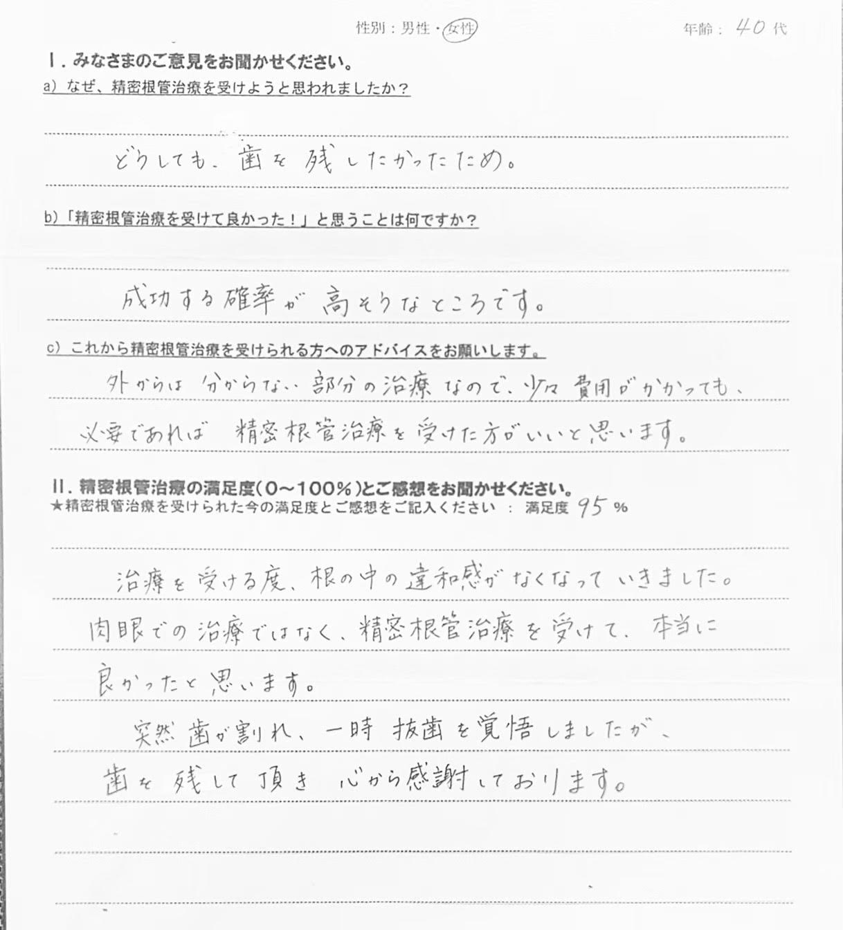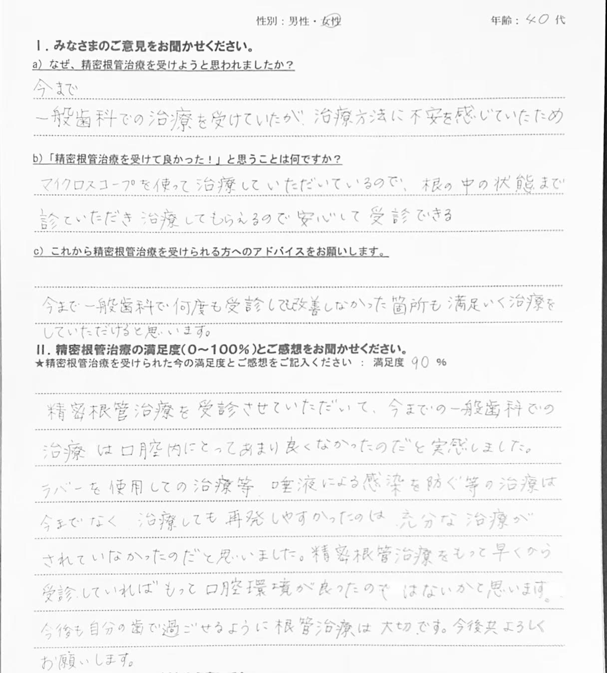 【患者様の声】精密根管治療を受けた40代女性の方です。