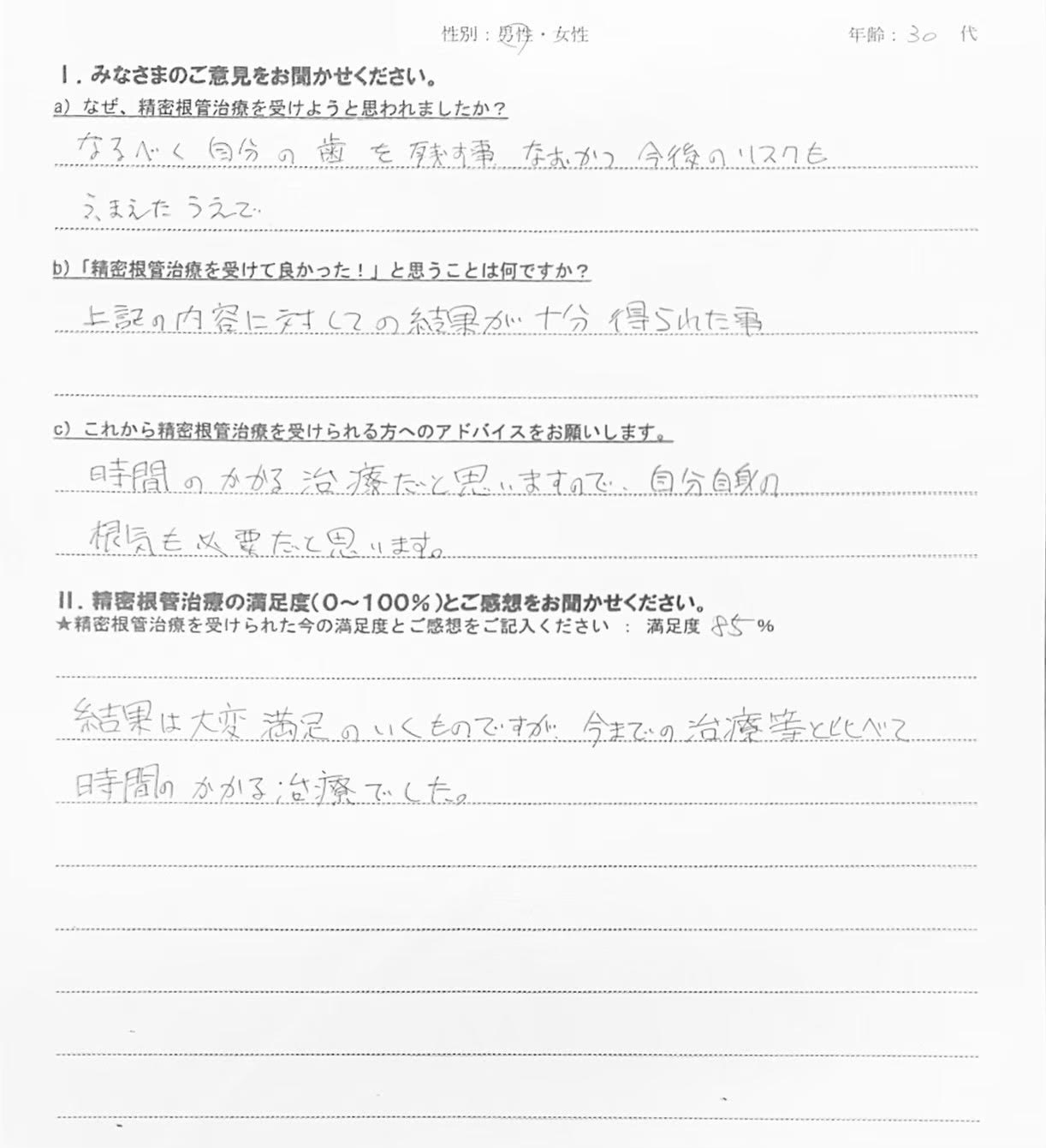 【患者様の声】精密根管治療を受けた30代女性の方です。