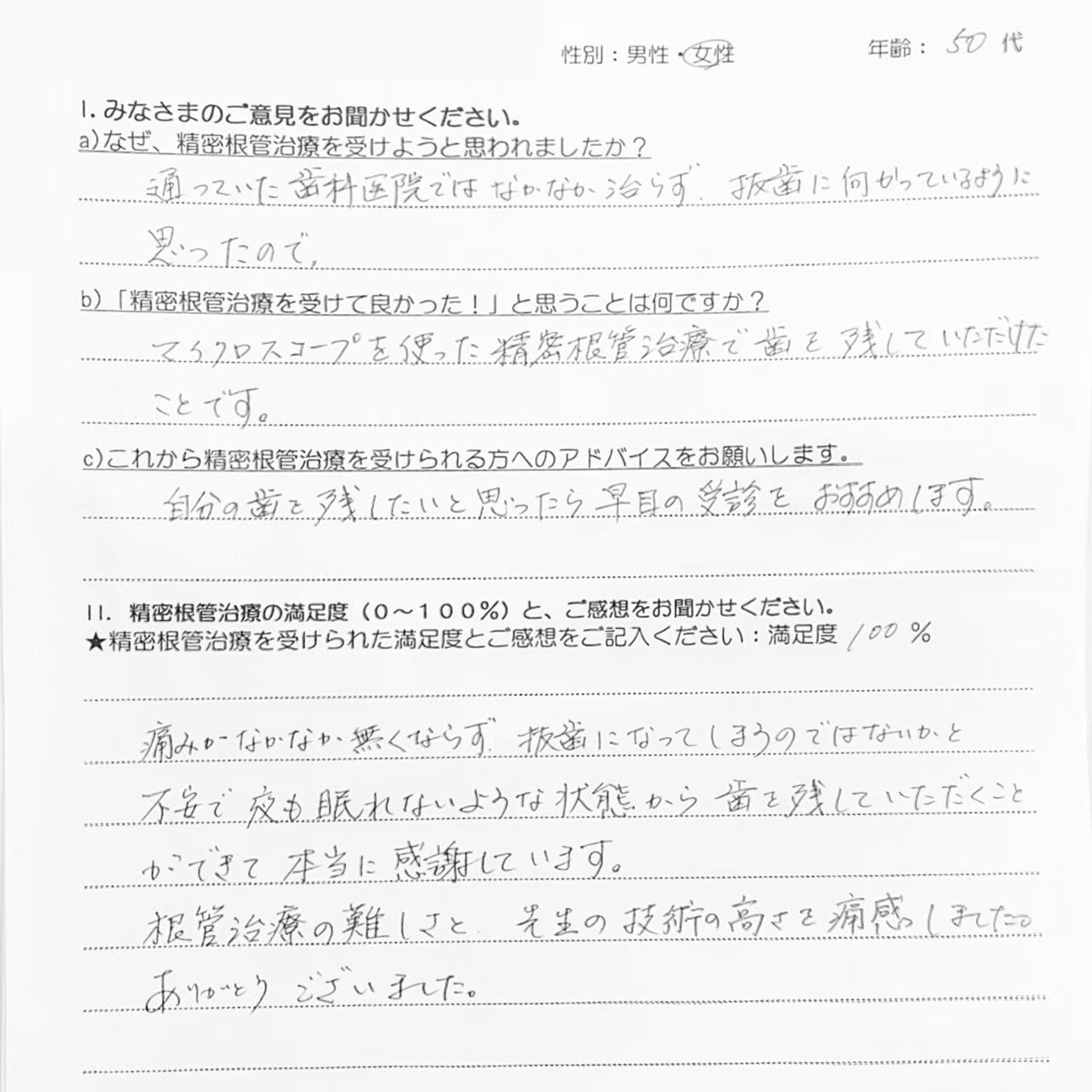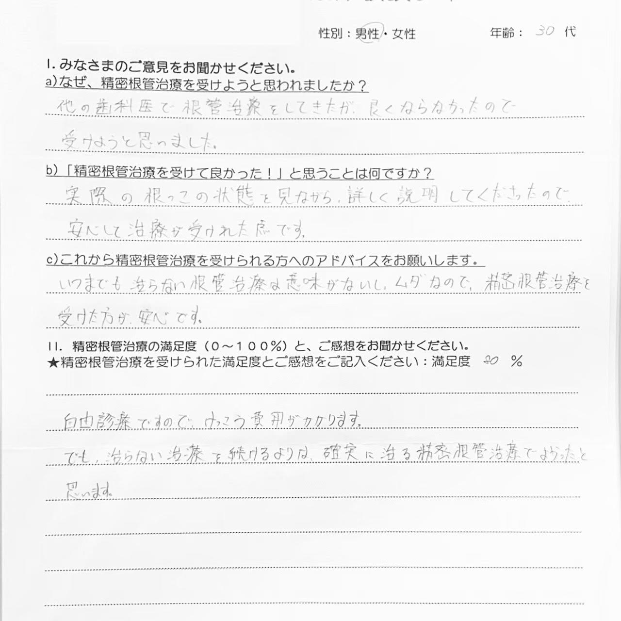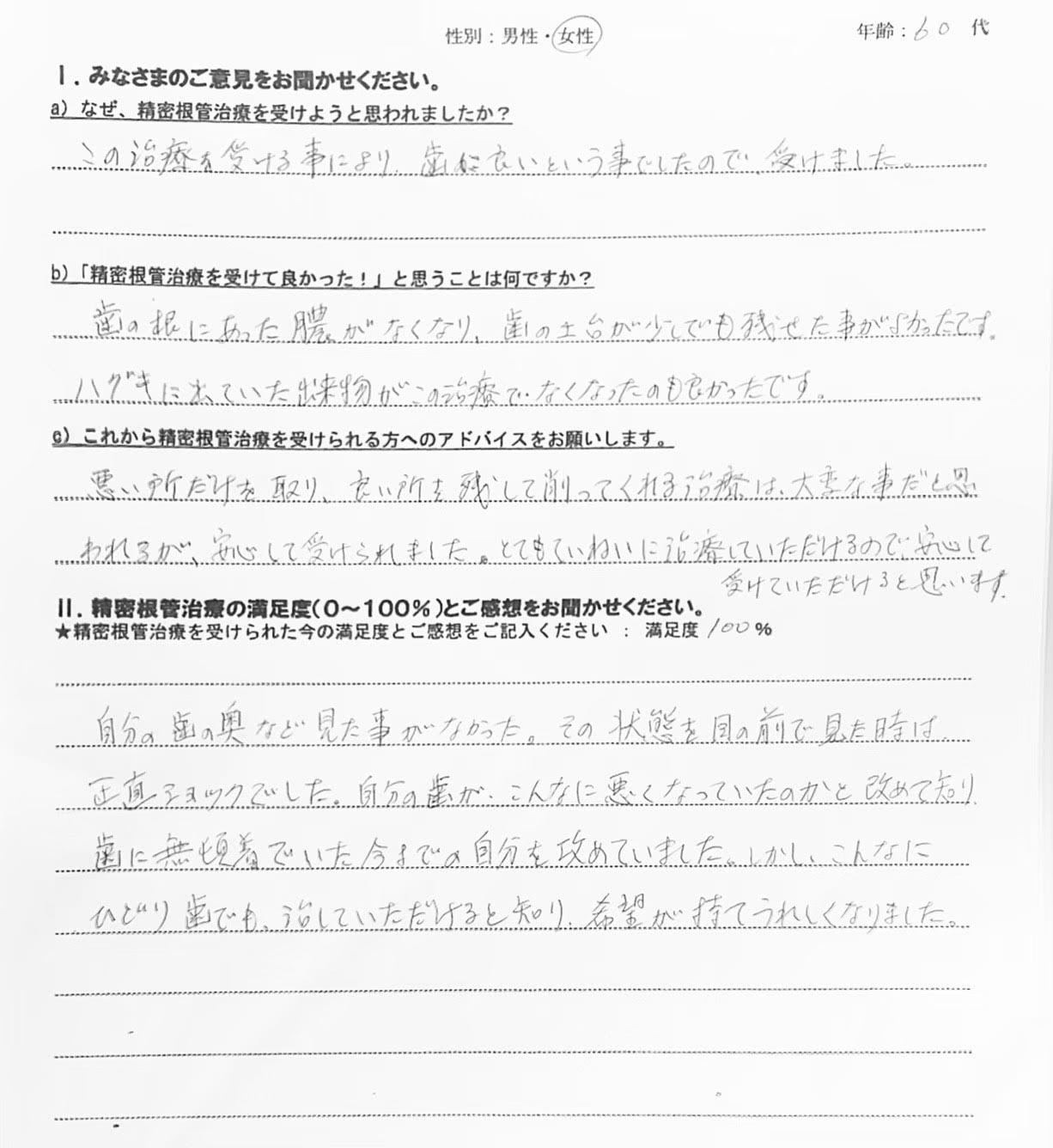 【精密根管治療を受けた方の声】 治療お疲れ様でした! アンケートへのご協力ありがとうございます! 痛みも治り、歯も保存でき大変嬉しく思っています。 お互いに末永く、健康に気をつけて暮らしていきましょう…