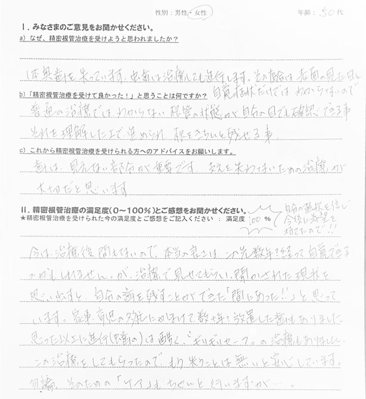 【患者さんの声】精密根管治療を受けた50代女性の方です