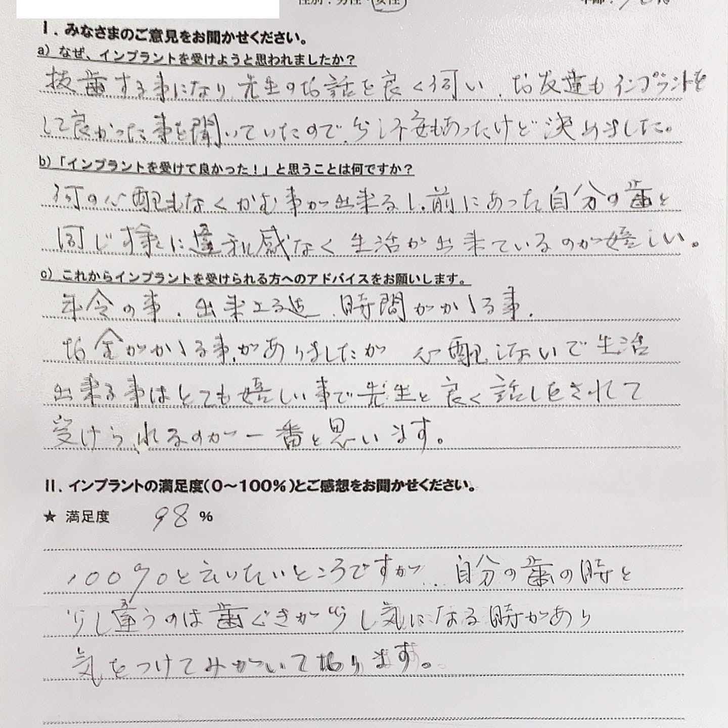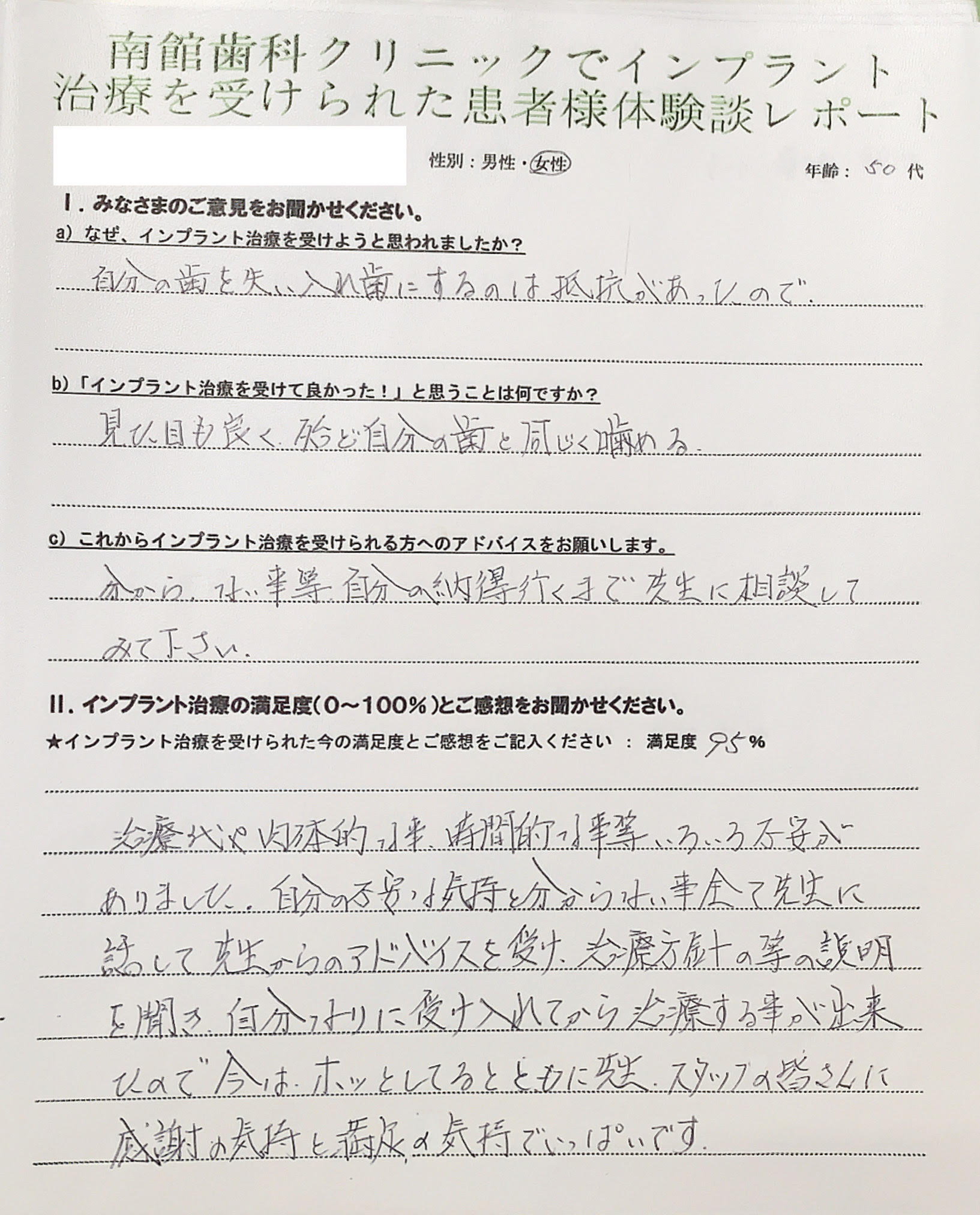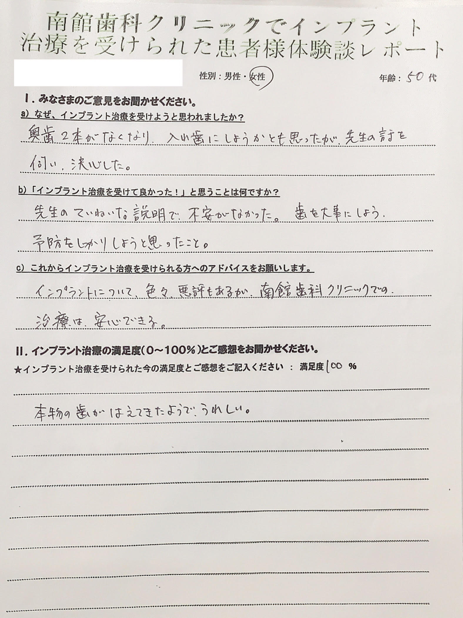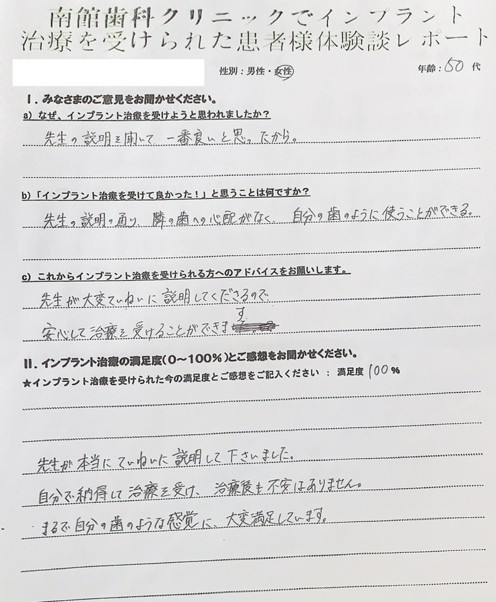 【患者様の声】インプラント治療を受けた50代女性の方です