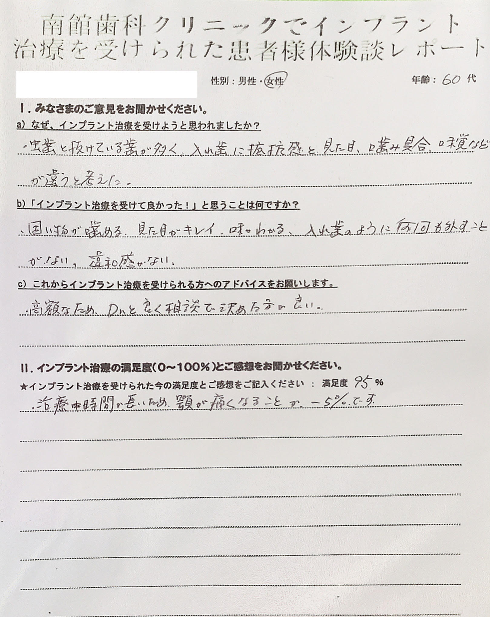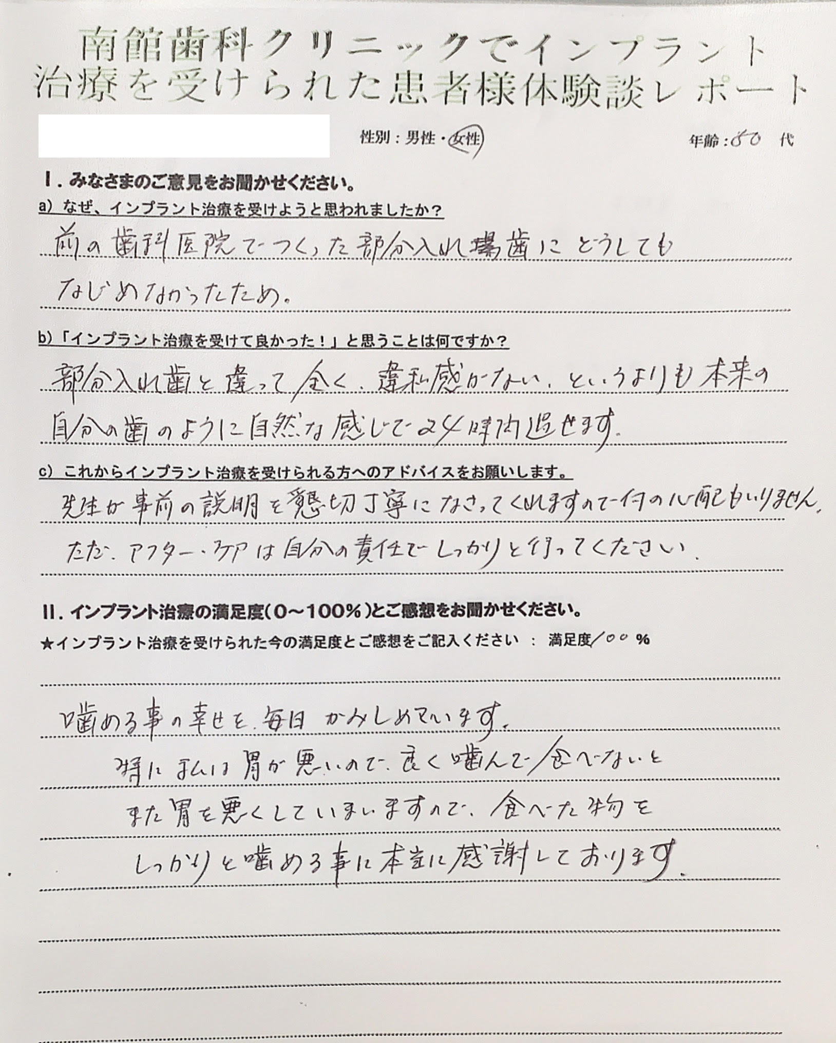 【患者様の声】インプラント治療を受けた60代女性の方です