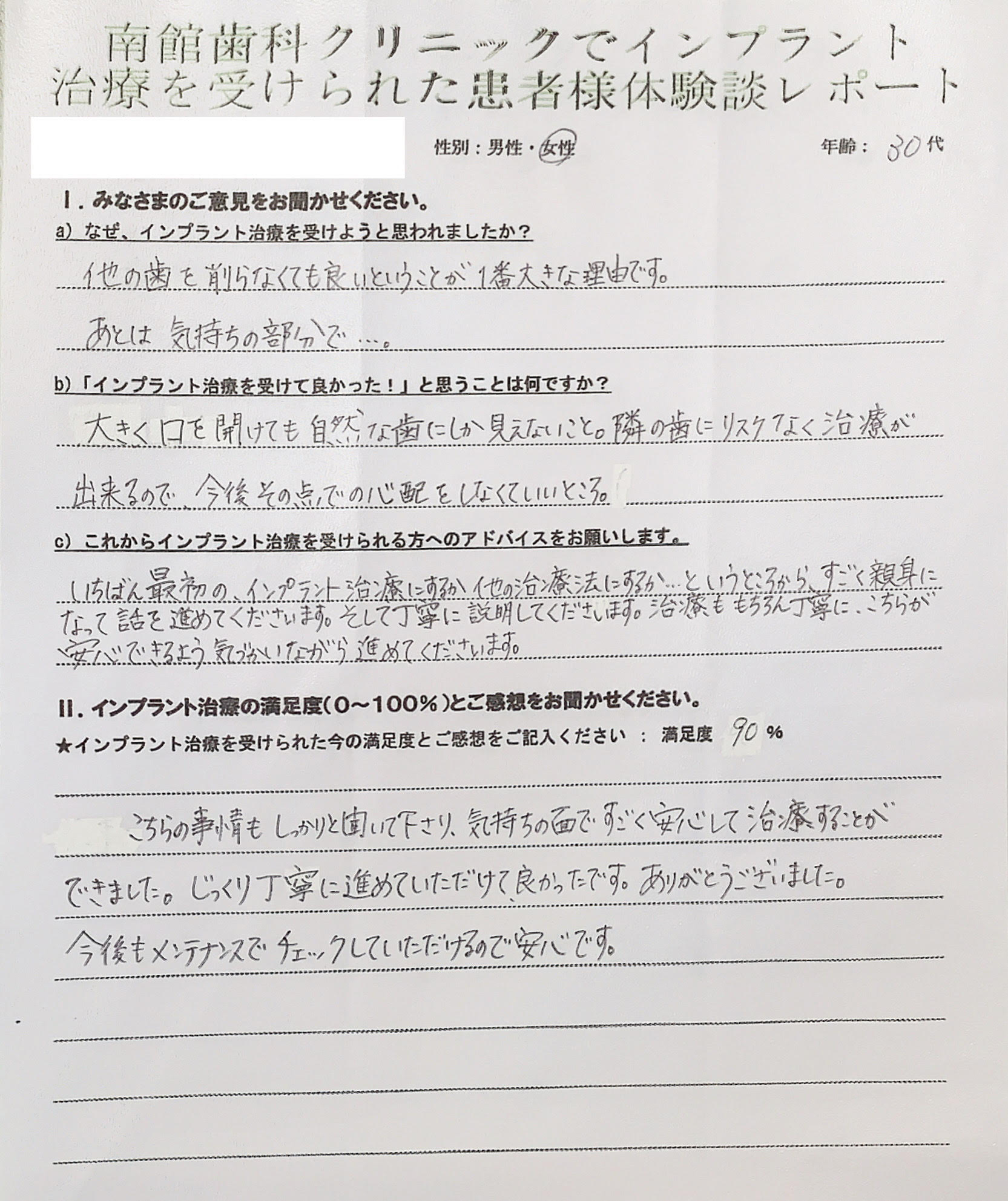 【患者様の声】インプラント治療を受けた30代女性の方です