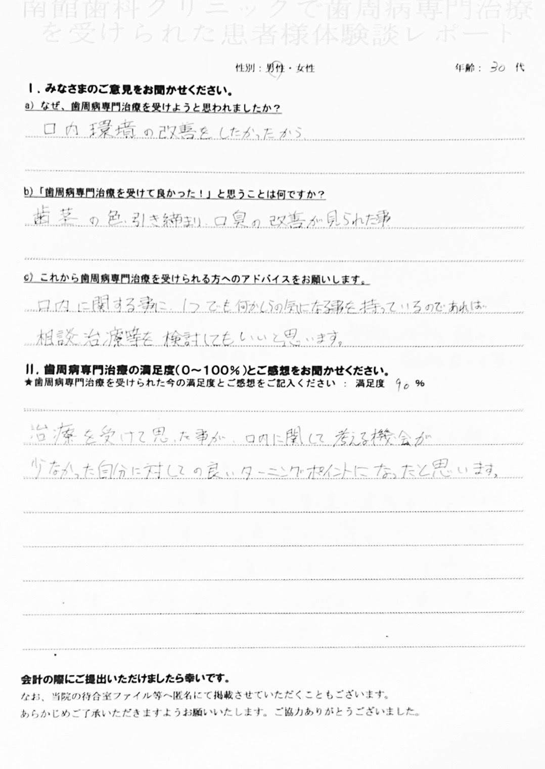 こんにちは! 山形市でマイクロスコープ治療をメインに行っている歯医者、南館歯科クリニックの歯科衛生士 山崎です。 歯周病専門治療を受けた方の声をご紹介します。 治療お疲れ様でした! 口臭も出血も無事治…