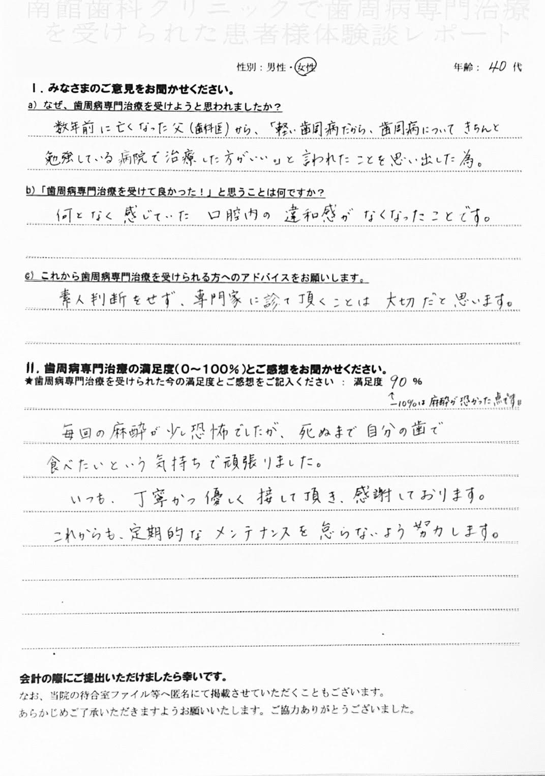 【患者様の声】歯周病専門治療を受けた40代女性の方です