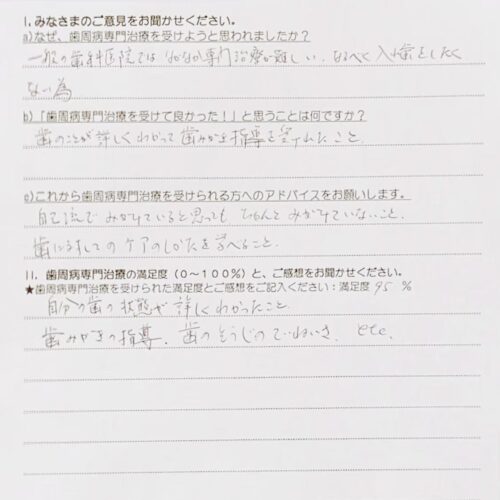 【歯周病専門治療を受けられた方の声】 治療お疲れ様でした! アンケートへのご協力ありがとうございますm(__)m ご自身が身体のことを詳しく理解し、病気の原因について知って頂ける様な説明を心がけていま…