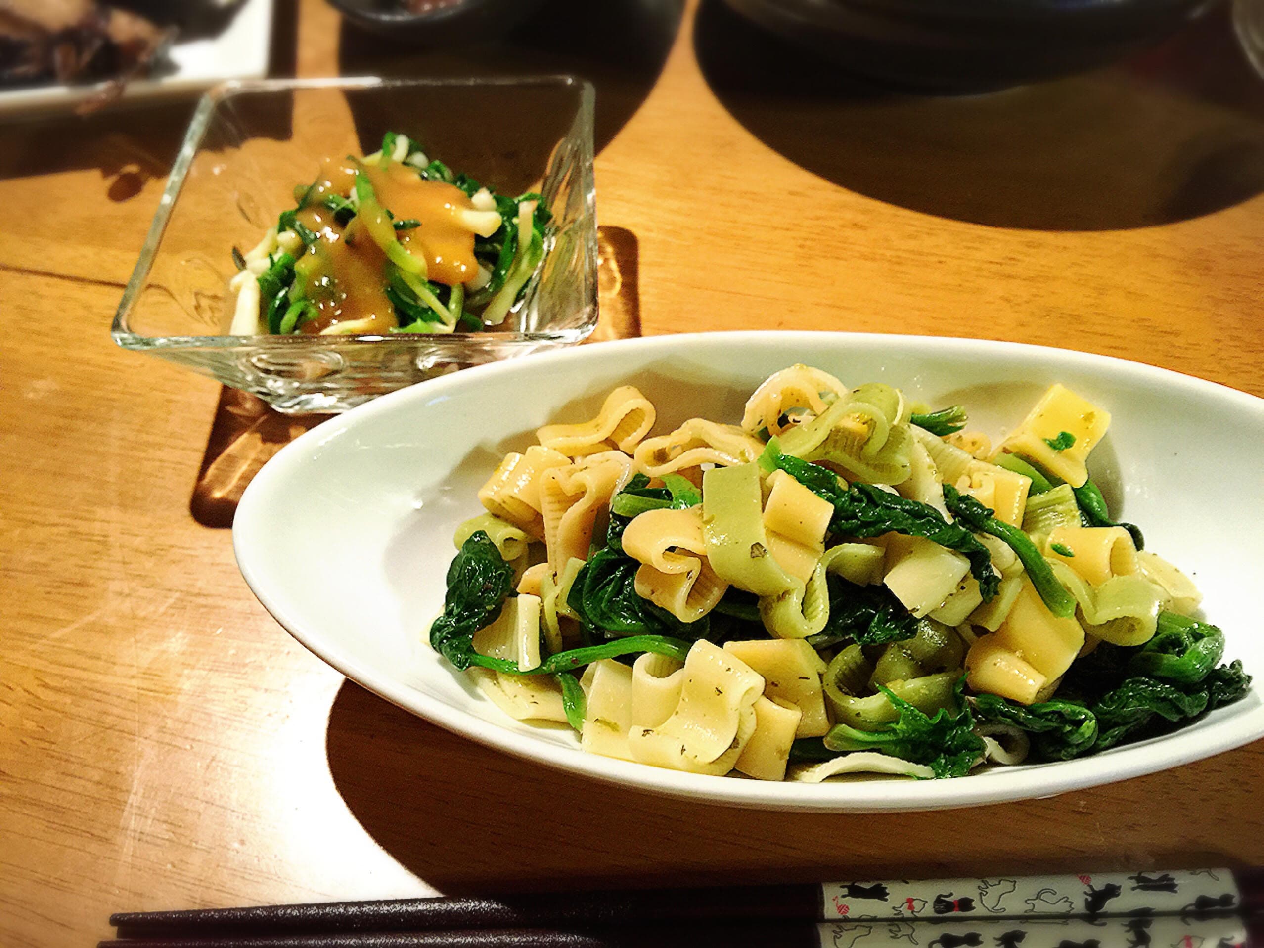 早速、浅葱は酢味噌和えに、ほうれん草はパスタと一緒にバジル胡椒ソースでいただきました。