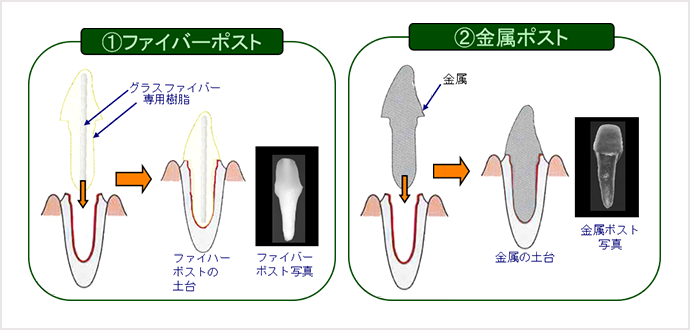 そこで歯の土台になる部分(これをポストといいます)を作ります。その材料には①ファイバーポスト、②金属ポストがあります。