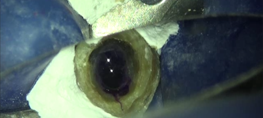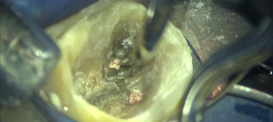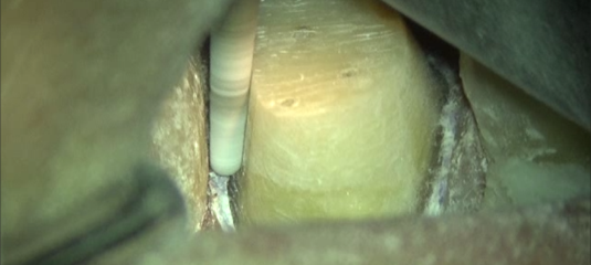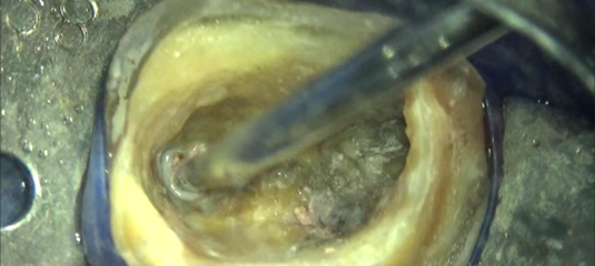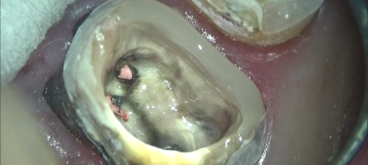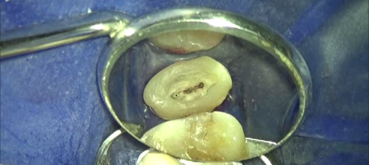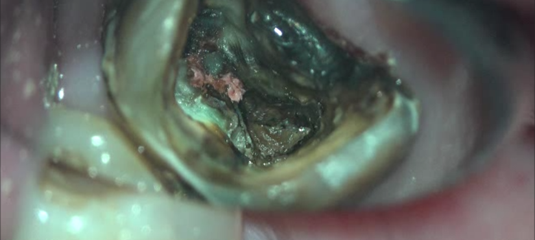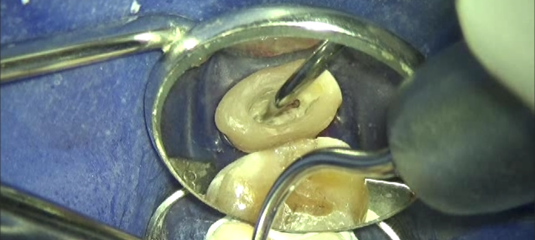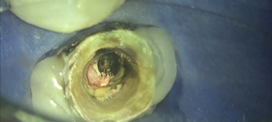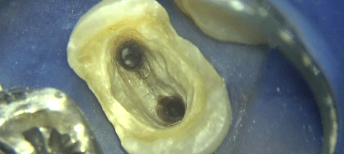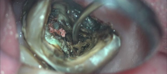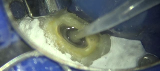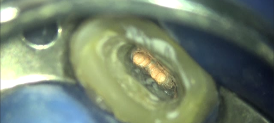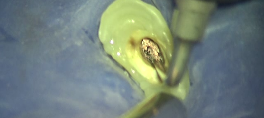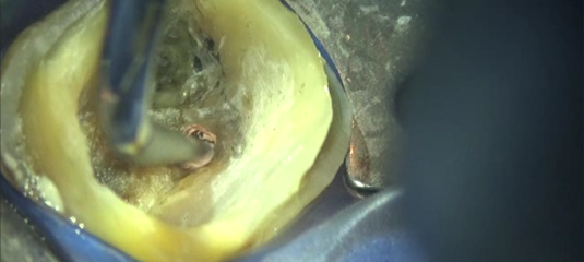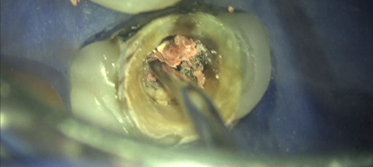 根管治療の第一ステップは、虫歯を完全に取り除くことからスタートします。ここでもマイクロスコープを使用します。すべて除去することが大切になりますので、虫歯検知液も併用し、徹底的に感染歯質を除去します。成功を左右する大事なステップです。