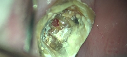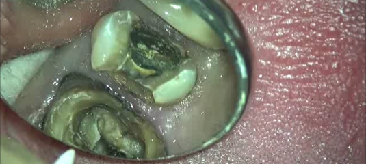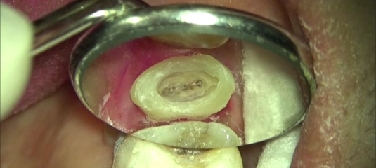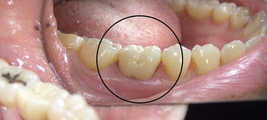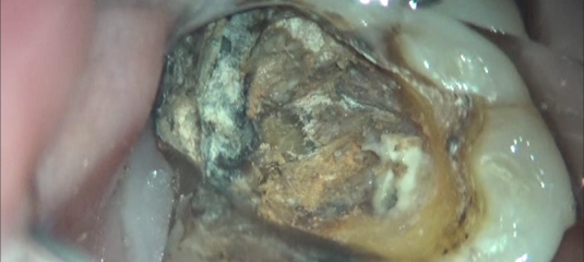 虫歯を除去した直後です。一部虫歯が歯肉の中まで進行し、壁が欠損しています。