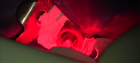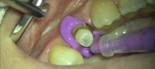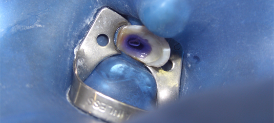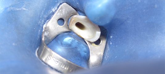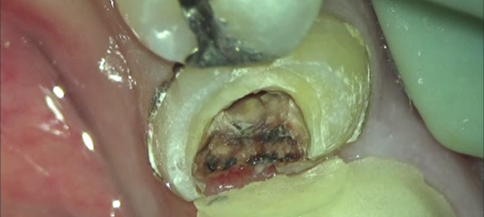 ここで初めのステップに戻りますが、虫歯を完全に取り除いた後、ラバーダムを維持する歯質がない場合、先に接着性のレジン(樹脂)で壁を作り、歯の周りが全周壁になるように処置をします。これを隔壁処置といいます。