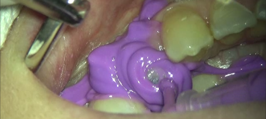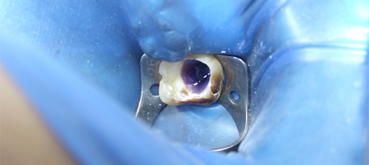 虫歯を完全に取り除いたら、次に、ラバーダム防湿(ゴムのマスク)を行います。ここで重要なのは、隙間から唾液が侵入しないこと、治療中の強力な薬剤が口腔内(お口の中)に漏れないようにしなければならないということです。