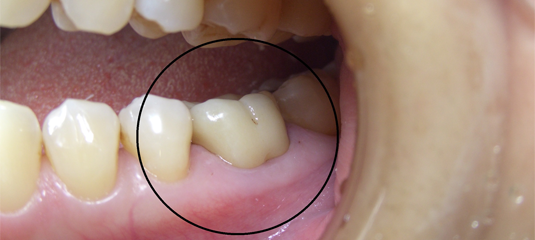 症状としては、痛む、腫れる、咬むと痛い、違和感などがありますが、無症状で進行する場合もあります。身体の抵抗力が下がったときに、症状がでるというのも特徴的です。