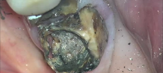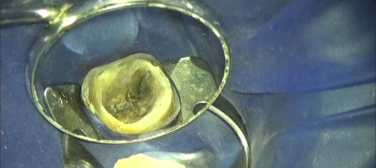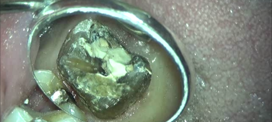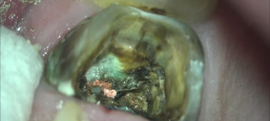 被せ物(メタルのコアも含め)と虫歯を除去したところです。歯の全周にわたり、健全な歯質の壁がありません。