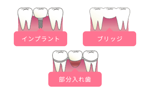 また、抜いたままにしておくわけにはいかないので、費用と時間をかけて欠損歯の治療(インプラントやブリッジ、入れ歯など)をする必要性が出てきます。