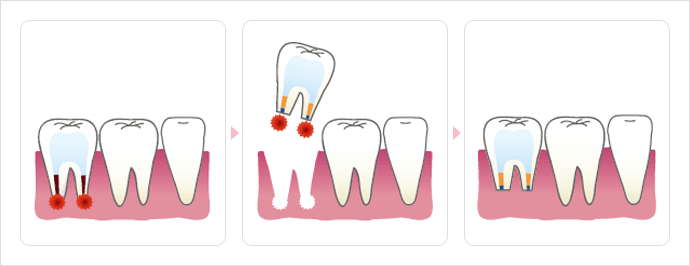 問題のある歯を一度抜歯して治療し、治療後に歯を元の場所に再植する処置です。 あくまでも、歯を残すための「最終手段」として行います。
