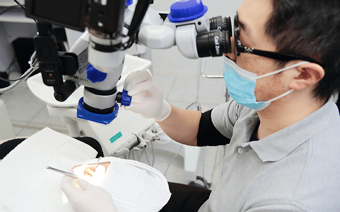 そこで、当クリニックでは再発を防ぐために、アメリカの専門医に準じたマイクロスコープによる精密根管治療を行っております。