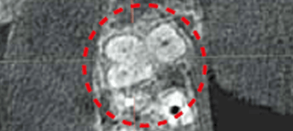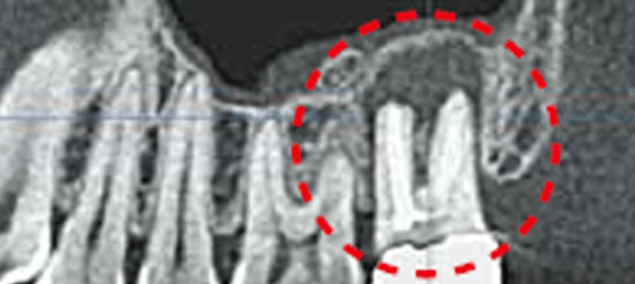 レントゲン画像で、根の先に黒い影が見られることがあります。 根管治療で対応できるのか、外科的処置が必要なのか診断する 必要があります。CT画像は、病巣の大きさや位置を立体的に診 断することができます。また、病巣が神経に近いのか、解剖学的 にリスクの高いところまで広がっていないかなども確認すること ができます。