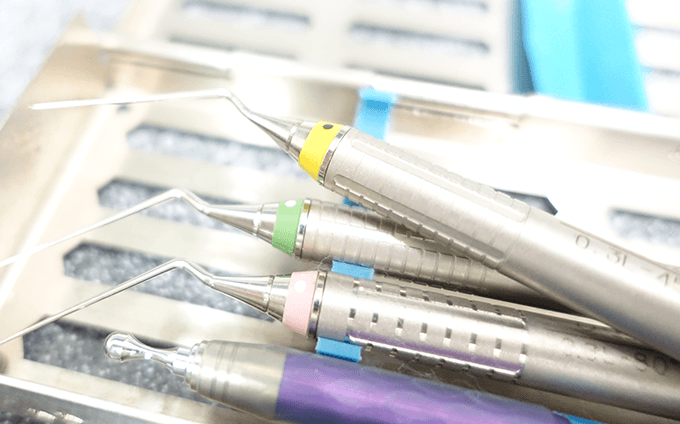 もともと歯根と言われる歯の根っこは細く、その内側にある根管内はさらに細く入り組んでいます。この根管を、歯を削るための器具で不用意に削ってしまうと、削りすぎてしまい歯質が薄くなり割れやすくなったり、最悪の場合、歯根に穴が開いてしまう恐れがあります。そのため当クリニックでは、細い根管内の汚染物や、虫歯、神経の残骸などは、超音波の器具を使用し、専用の超音波チップで振動を加えながら、こそぎとるようにして機械的清掃を行っていきます。歯にとって最も安全でやさしい方法と考えます。